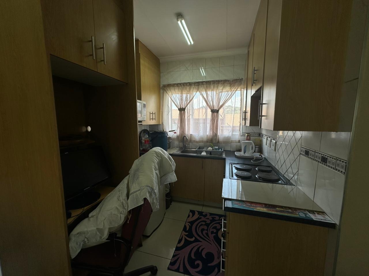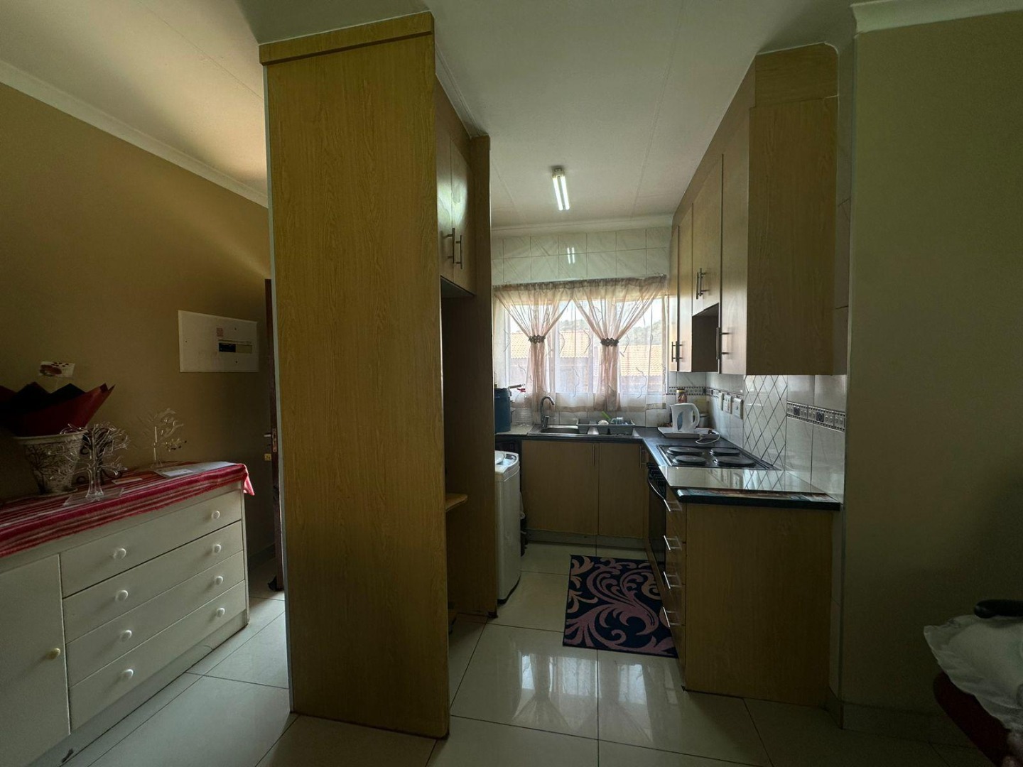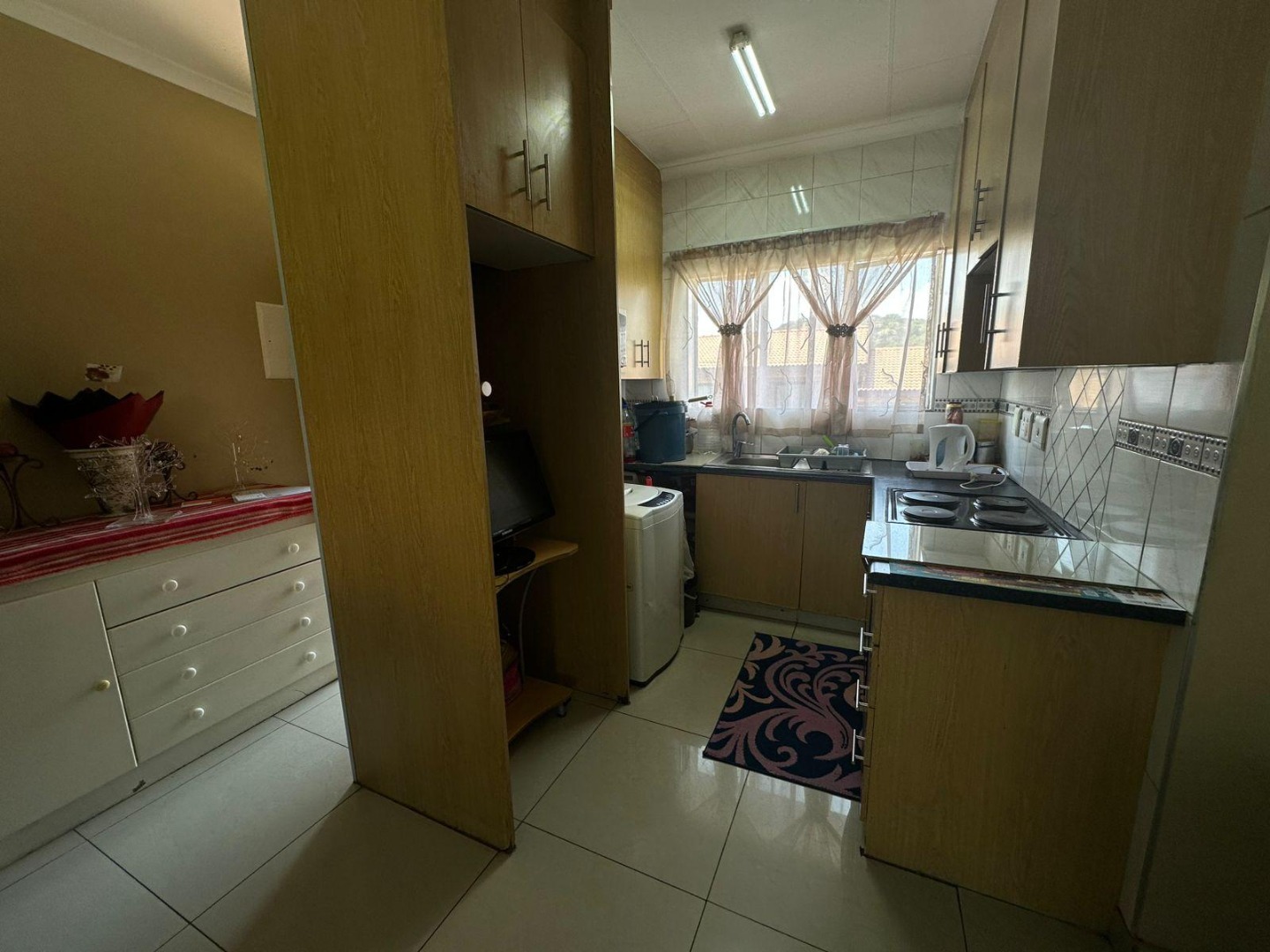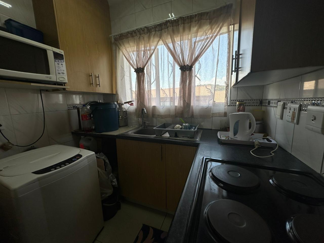 The kitchen is neatly finished with plenty of cupboard space, a fitted stove, tiled walls, and a practical layout offering full functionality. Whether you’re a home cook or enjoy simple living, this kitchen will meet your everyday needs comfortably.